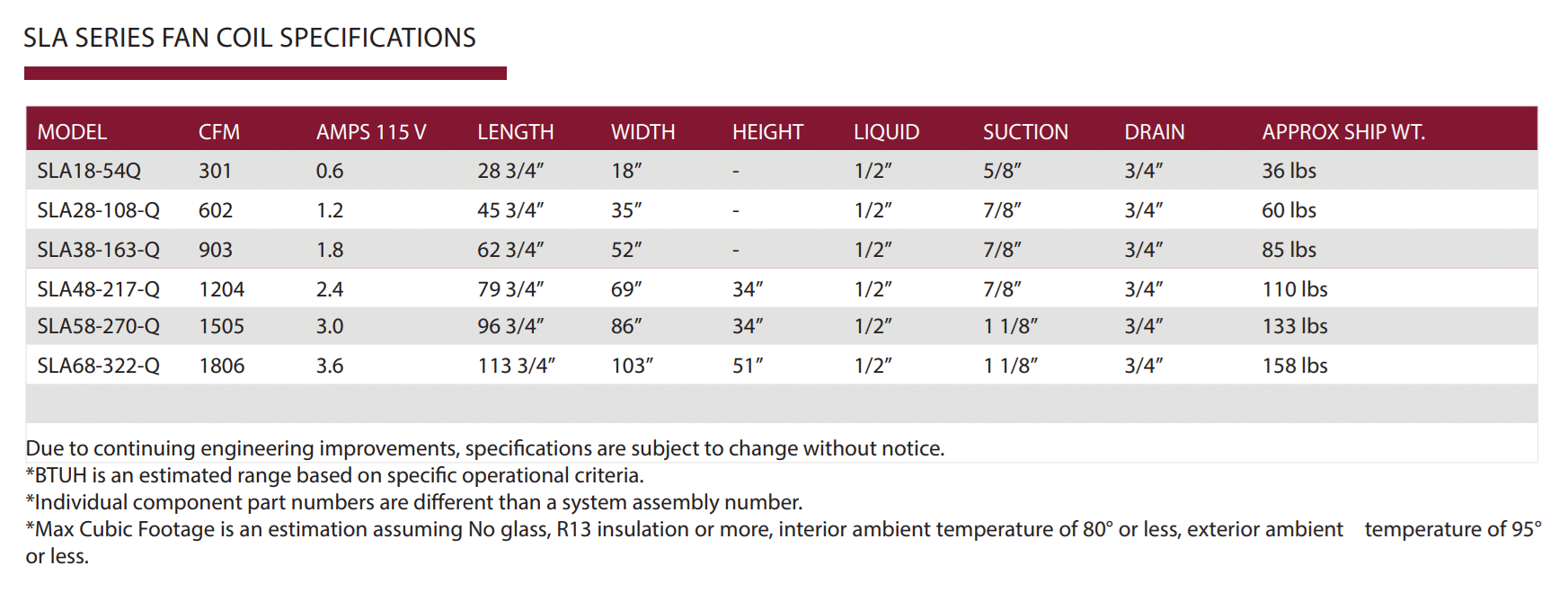 • BTUH Capacity calculated at 17° TD, 38° ST, 55° Room